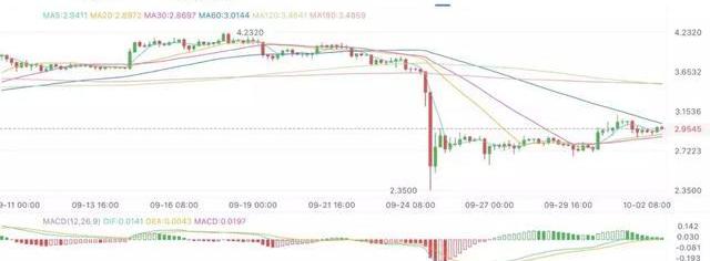 EOS今日反弹力度较大,或将打开一定的反弹空间,距离上方强阻力3.2美元也有一定空间。EOS支撑位2.85USDT,压力位3.20USDT。