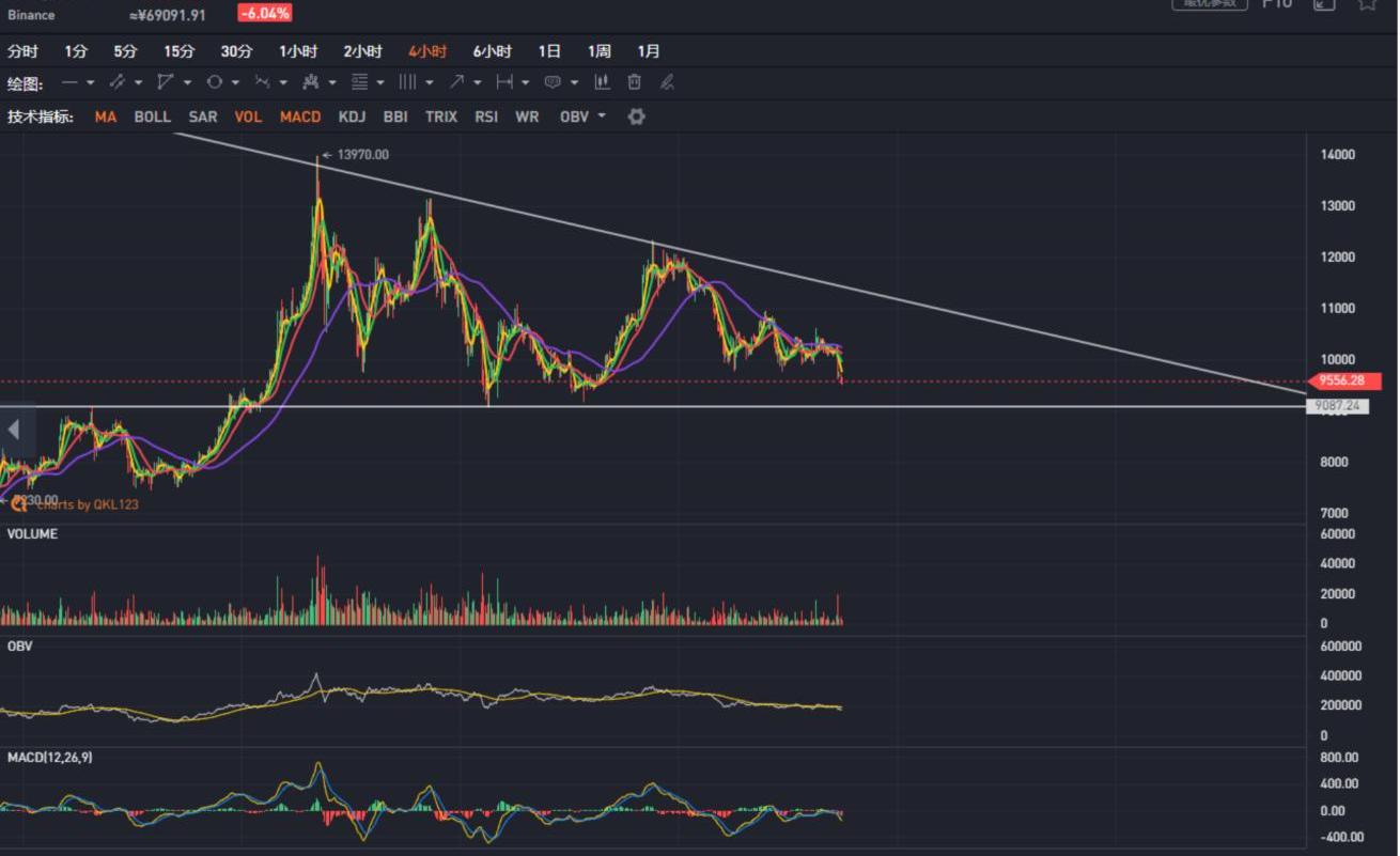 今日凌晨01时前后,BTC被小幅拉升至10200美元后放量快速下行,目前最低触及9500美元,空军暂时得到压制,但多军反攻意愿不强,市场不确定性依然较大。从4小时k线来看,BTC跌破日线上行收敛三角,若短时不能上行收敛则很可能继续下探支撑位。
