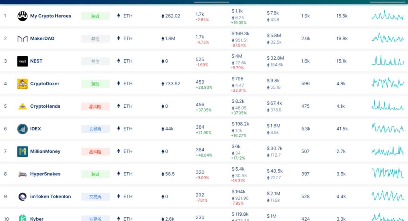观察DappRadar统计数据,24小时ETHDApp整体活跃程度略有减少,新增较昨日略有减少。其中,游戏应用MyCryptoHeroes的24小时活跃用户数1.7k,24小时变化-2.65%;金融应用MakerDAO的24小时活跃用户数1.7k,24小时变化-4.73%;交易应用IDEX的24小时活跃用户数384,24小时变化+21.90%。