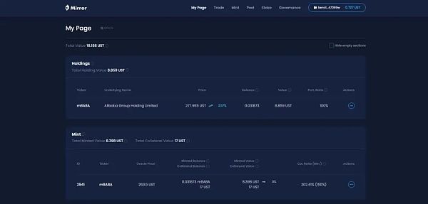 而 UST 最小抵押比率为150%,mAsset 最小抵押比率为200%,质押铸造的美股合成资产 Token 也同样是链上的,可在 Uniswap 和 Terraswap 上进行交易。