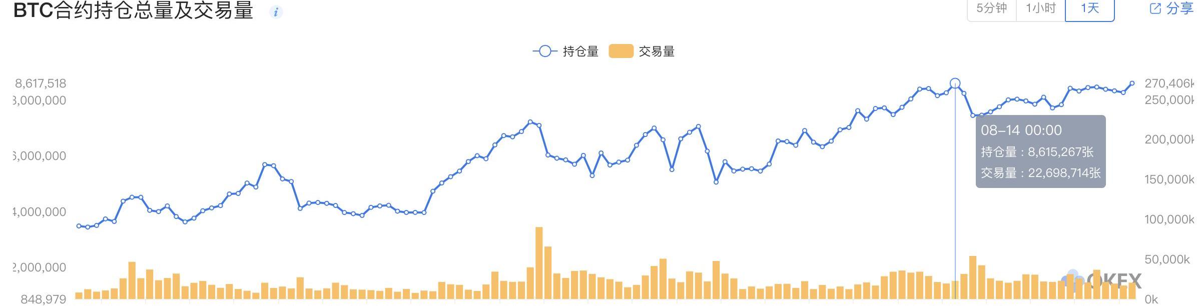 现货市场低迷,期货合约市场的持仓量却高居不下,投资者都在持仓等待变盘。横盘意味着低振幅,对于合约交易来说,要在低振幅中获得高利润,必然要加大持仓量。因此,实时结算或者每日结算提取的资金很有可能会继续流入到新开的合约中。稳一些的投资者或许会多开一些新的头寸,而急躁者则可能在开仓的同时加高杠杆。