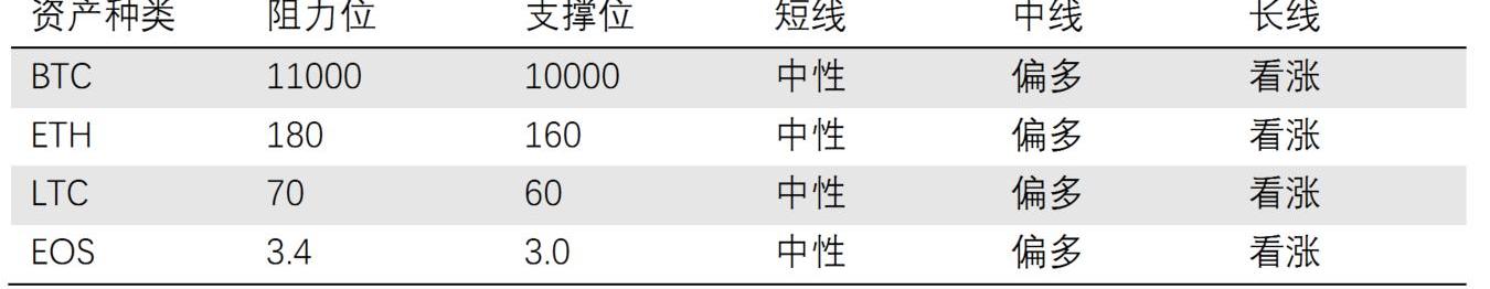 BTC长期趋势向好,目前处于局部调整阶段,疯牛行情可能在未来一至两年到来,逢低加仓。智能合约平台龙头ETH、山寨币龙头LTC、DPoS龙头EOS的BTC相对价格接近年内新低,可逢低配置一些。