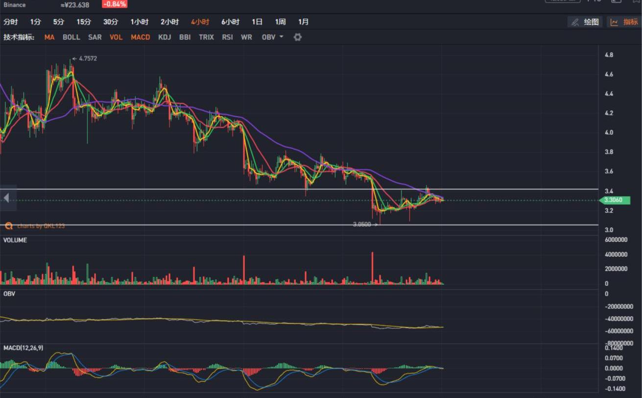 EOS从前日高点3.46美元震荡下行,目前回落至3.3美元附近,量能持续萎缩,短时有蓄力上行的可能。EOS/BTC交易对接近年内新低,目前在0.00032BTC附近小幅震荡,表现依然弱势。