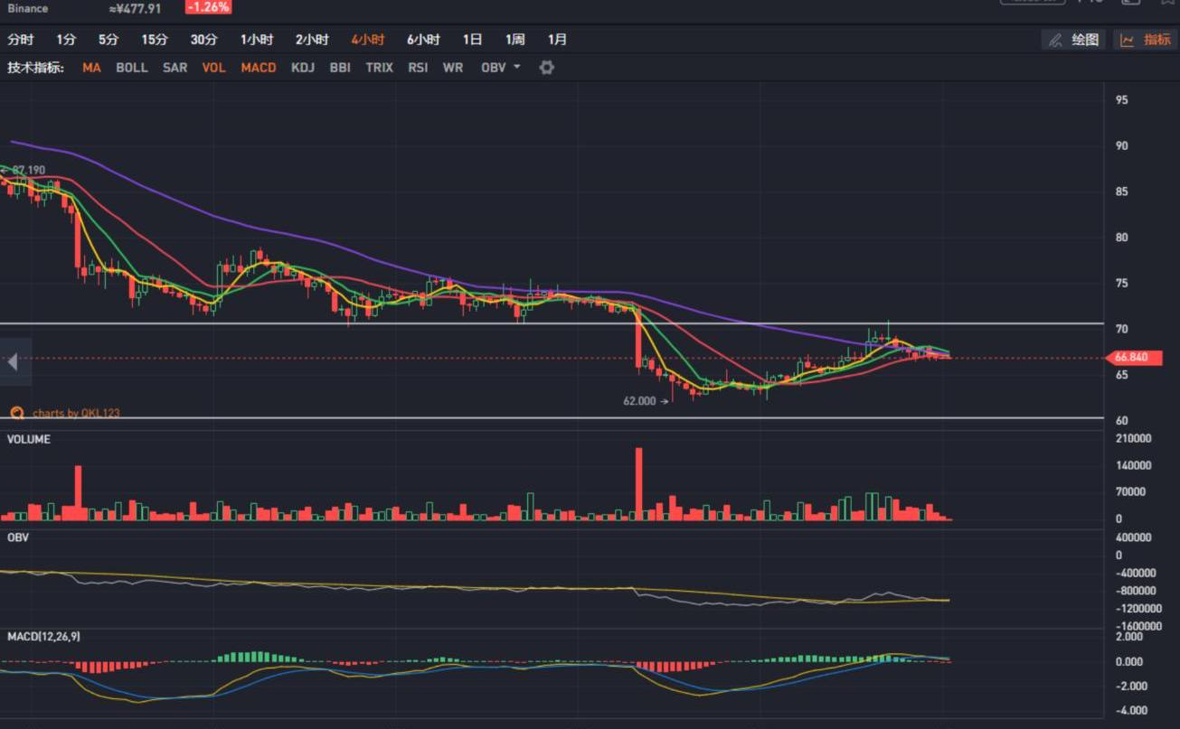 LTC从前日高点71美元震荡下行,目前在66美元附近,短时有企稳迹象。LTC/BTC交易对在年内新低0.0063BTC附近震荡,表现相对弱势。