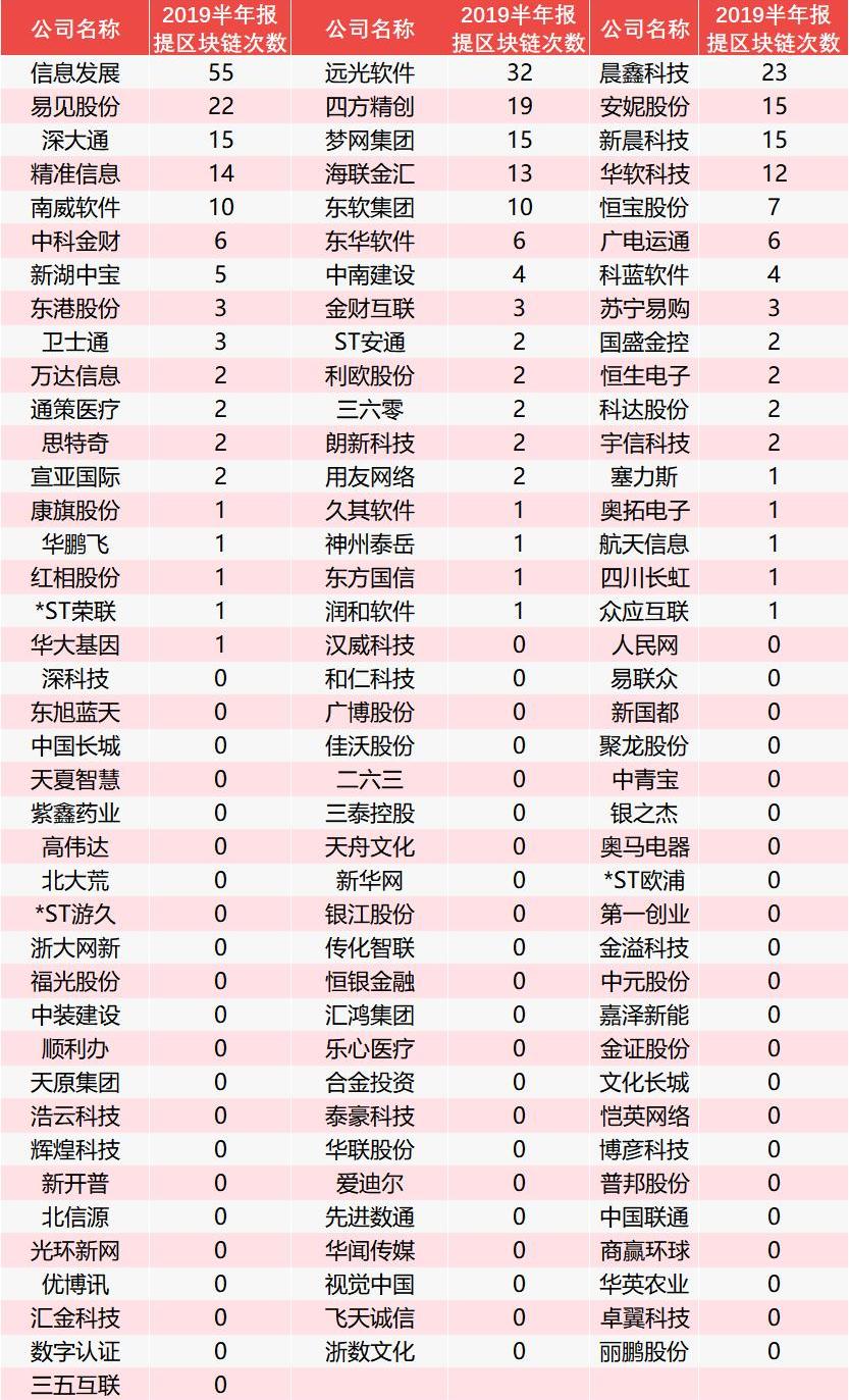 与去年同期相比,梦网集团、深大通、南威软件、卫士通、利欧股份、通策医疗、朗新科技、宇信科技、华鹏飞、红相股份、*ST荣联、塞力斯、久其软件、神州泰岳、四川长虹这15家公司首次在半年报中提到了区块链。