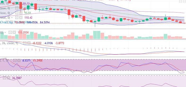 LTC一度跌至80区域,跌破陈楚初所提到的关键支撑,短期走势已经回归到了布林带轨道内,若不打破当前低点80一线,则走势将会慢慢形成反弹。当前可顺势在80附近跟进一些多单,等待反弹。