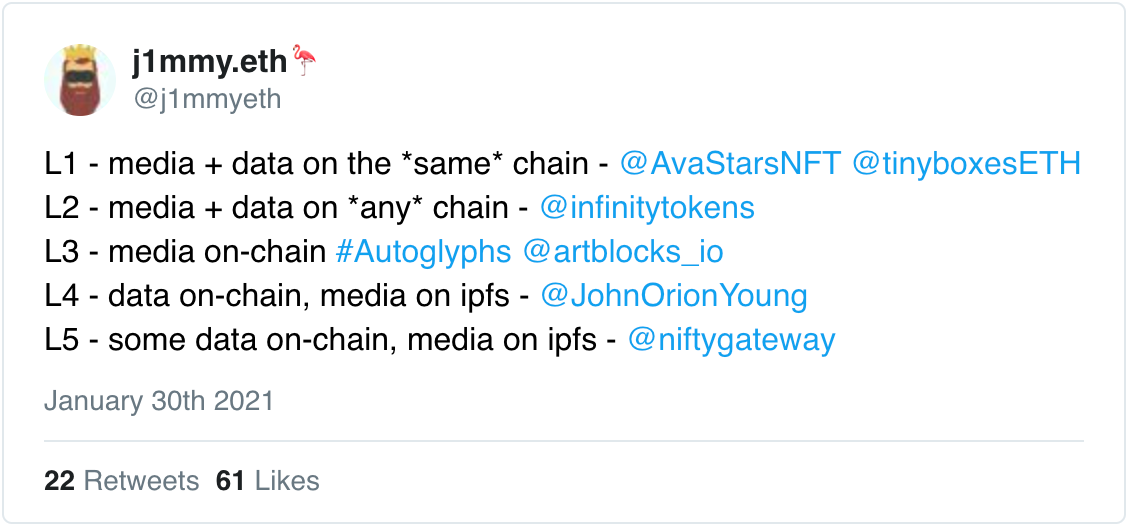 就像我们评价一个 DeFi 应用时,会把去中心化程度当作评价指标。当我们评价 NFT 项目时,它的「上链程度」也应该是我们需要考虑的事情,即它们的媒体图像和元数据是否完全可以从以太坊等区块链中提取。