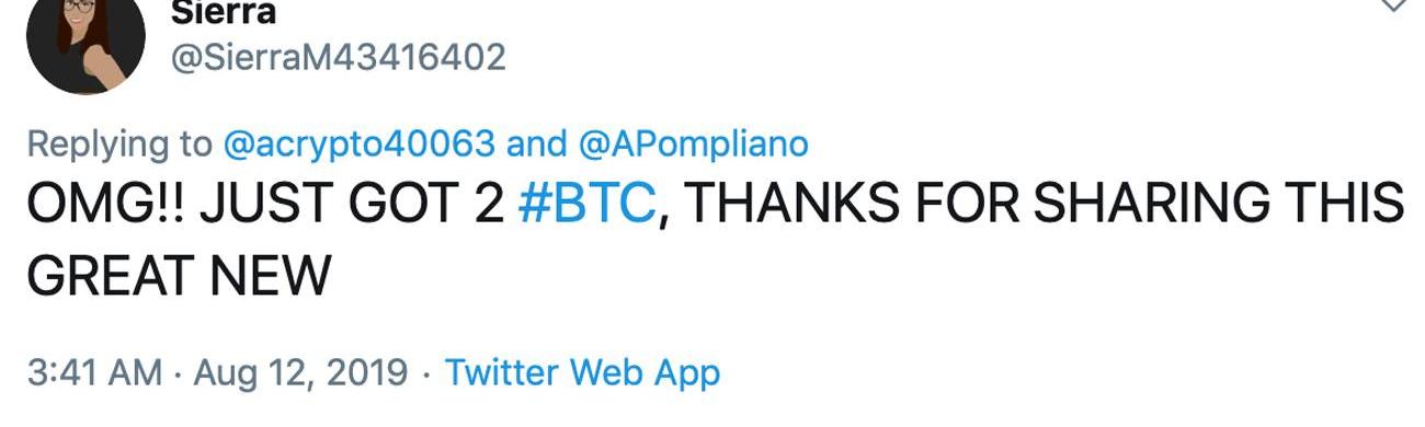 例如,8月12日,摩根溪联合创始人Anthony“Pomp”Pompliano在Twitter上发布了他通常每周都会收到的投资者来信,人们可以在那里注册并定期收到Pomp的电子邮件。在Pomp的推文下是一个名为“Adam“的账户,评论说:“感谢Coinbase,我刚刚收到了1.90680BTC。任何人都可以参与,剩下的名额不多了。“在该声明下是一张伪造的Coinbase帐户截图: