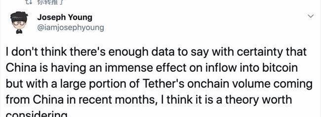我不认为有足够的数据支持说中国对资金流入比特币产生了巨大的影响,但最近几个月,Tether很大一部分的链上交易量来自中国,我认为这是个值得思考的问题。