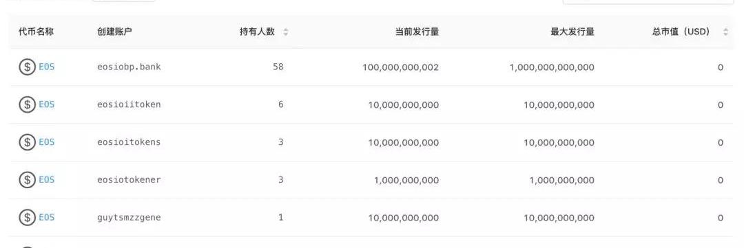 在EOS上发行的Token是和特定的合约账号联系在一起的,而且在EOS?上发行Token时,并没有对代币名称进行去重,例如在EOS网络上名称为EOS的Token就有好多个。