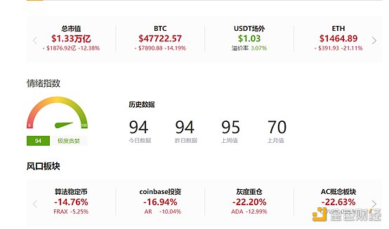 加密总市值下跌超12%,情绪指数显示极度贪婪。此外,各热门板块也呈现不同程度的下跌。