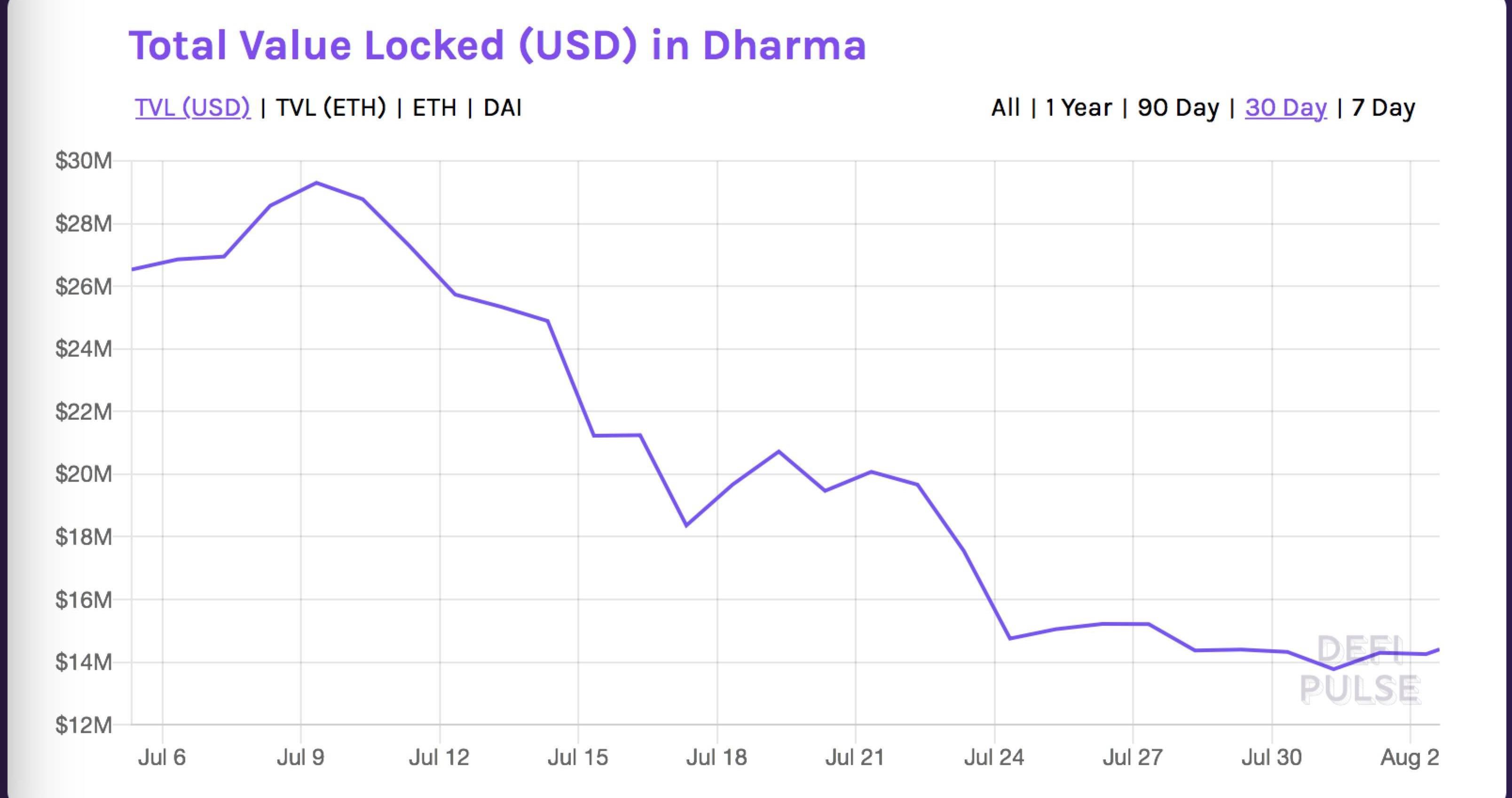 根据DeFiPulse的数据,Dharma锁仓资产数量确实在持续下滑,USD资产确实从6月9日的29.3M跌至如今的14.4M,跌幅达51%。