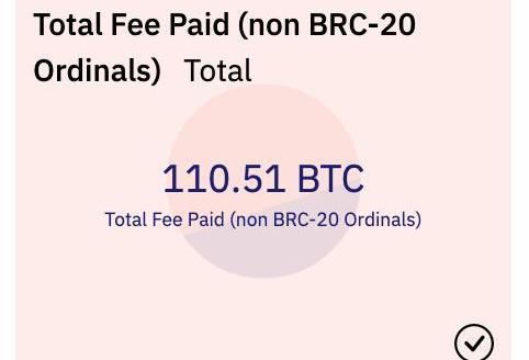 如果计算整个ordinals协议,那还需要增加这个市场中非BRC-20部分,常见就是NFT那边。非BRC-20的Ordinals为矿工贡献了110.51BTC两者相加,一共贡献了604BTCCC@cryptokoryo