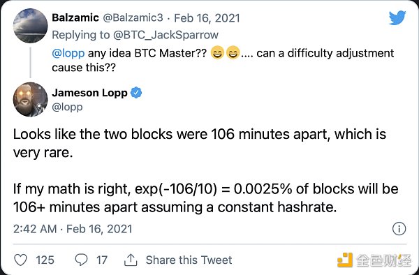 结果表明,有190个区块在前一个区块出块后106分钟才被挖出,占迄今挖出的67万个区块中的0.0028%,非常接近0.0025%的预期值!这个结果很容易通过计算得出,但只能代表某个特定时间段内出块时间的差值分布情况。