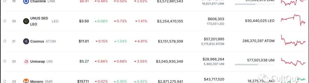 三年后,一些应用已经使用了这三种策略,取得了不同程度的成功,而且大部分价值已经被协议捕获。你需要向下滚动到CoinMarketCap按市值计算的顶级Token名单上的第20名,才能找到一个应用Token——Bitfinex的UNUSSEDLEOToken,而到第22位才能找到一个你听说过的应用:Uniswap。即使是Uniswap的UNIToken也是与协议挂钩的,而不是Uniswap应用程序,但这是在前30名中最接近的一个。