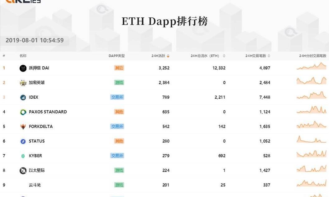 按照08月01日ETHDapp24小时活跃用户数进行排名,质押借贷DAI、游戏应用加密英雄、交易平台IDEX依然分别位列前三名,三者的24小时活跃数都在700以上,较上月同期有所减少。排名前十ETHDapp中,四个属于交易平台,三个属于娱乐或游戏类型,三个属于其他类型。其中,质押借贷DAI的24小时总流水最高,交易平台IDEX的交易笔数最高。