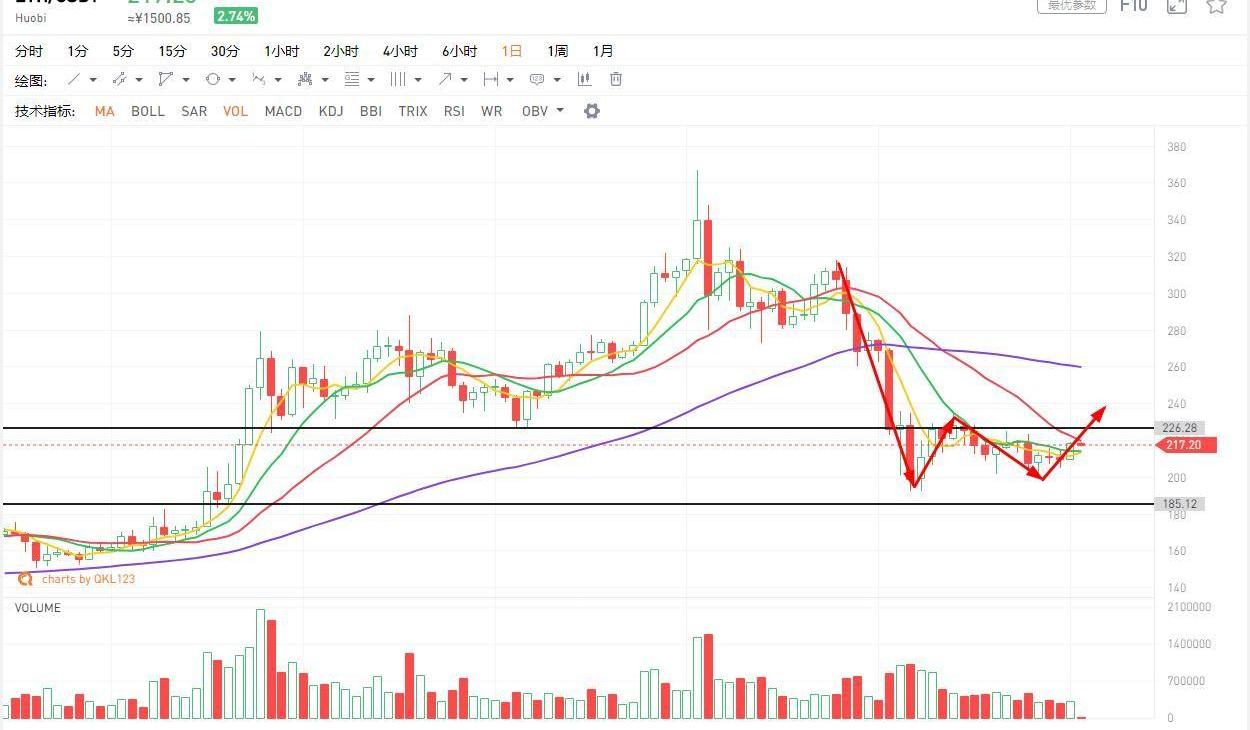 BCH先于市场进行反弹,目前已经连续反弹两天,走势强劲,已经来到330美元附近的压力位,目前正在蓄势,不排除会回踩一个5天线,但我认为突破330美元的压力位应该是大概率事件,跟前面两个标的一样,成交量一直是制约其反弹力度的重要原因,啥时候放量该标的啥时候会突破330美元的压力位,我认为该标的若能突破330美元,则最少会涨到345美元之上,有效跌破20天线均线则看涨无效,离场观望。
