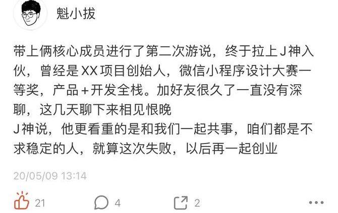 在创业之前,我跟随Vic做defimooc的翻译,拿到了不少$Rose空投,都分给陈剑几人购买了第一个NFT,陈剑对此津津乐道,包括去年底年终复盘时,陈剑也表示:“小拔我是完全相信的,未来做成了我会相信小拔会合理的进行分配的。“这也就是4个月前,但自从1月份我决定整顿产品后,一切都变了。附图是2020年5月份,拉上陈剑一起做AhaClub经验星球,和去年2月份其他人想拉陈剑一起创业时,我有感而发在即刻发的内容: