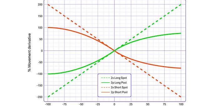 这一函数将有效防止任何一方失去全部价值。尽管清算风险被有效地消除,但收益大大降低。观察2p多头现货,如果基础资产升值100%,2倍杠杆将带来200%的收益。然而,在功率杠杆函数下,收益将减少至约75%。
