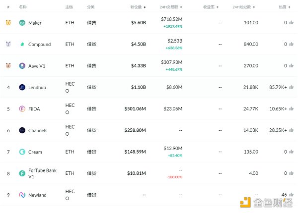 锁仓量排名前十的借贷平台 排名来源:DeFibox