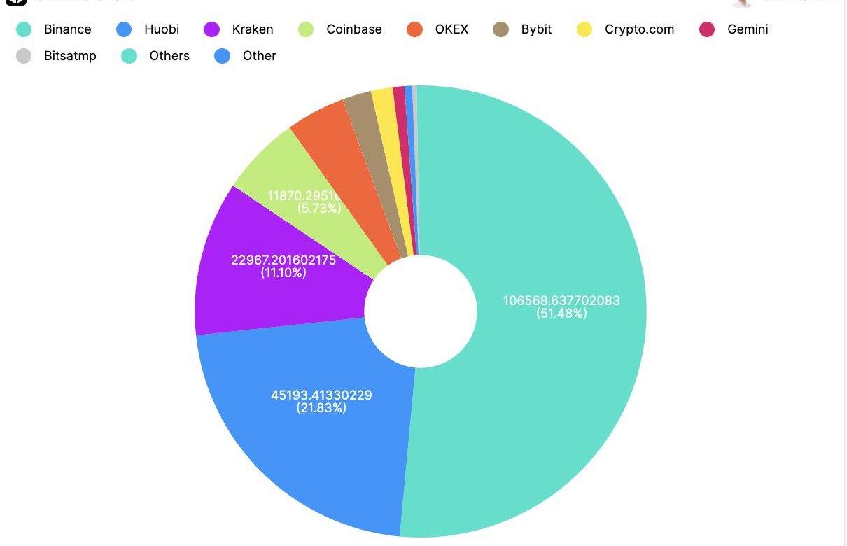 尽管大量ETH被发送到CEX,但并非都会被用于出售,其中一部分可能会使用这些CEX所提供的以太坊质押服务来赚取奖励/提款。在提供以太坊质押服务的头部CEX中,币安独占鳌头,不同CEX的质押ETH数量如下: