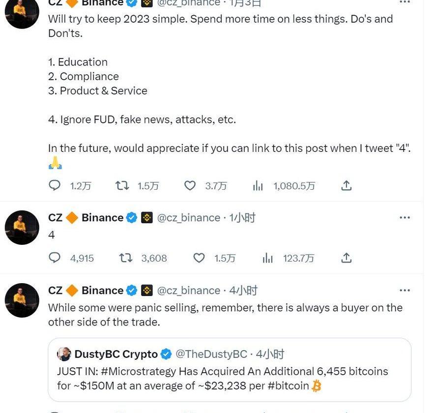 所以虽然这条新闻在市场中引发了新一轮的恐慌和FUD,但@cz_binance还是用“4”这个数字来代表了他的态度。其含义很有可能是这件事的最坏打算也未必会对Binance造成致命的打击。而对于CZ和Binance来说,花钱能达成的和解未必多可怕。不过话说这也是Microstrategy的魔咒,币市最大的未解之谜之一。