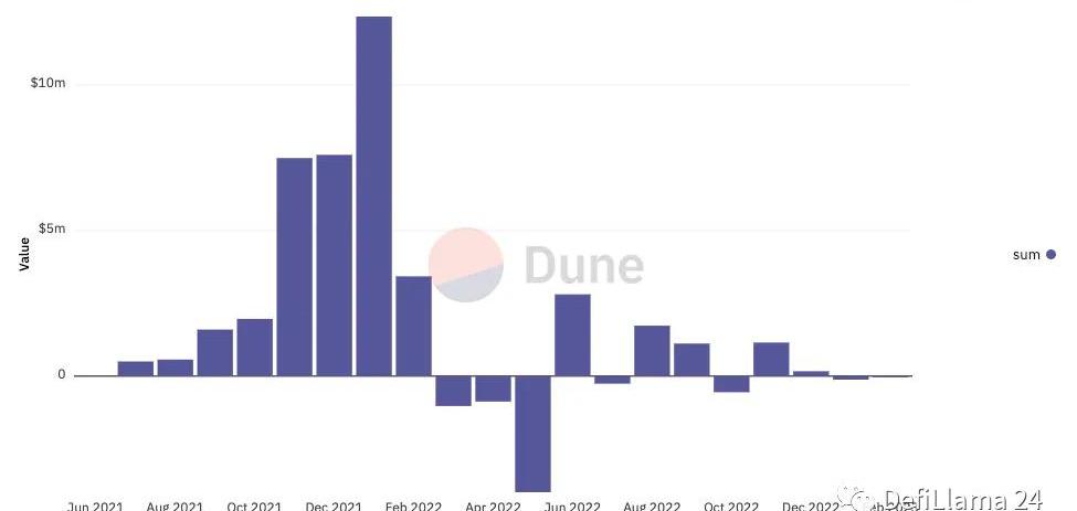 Frax的净收益高度依赖于CRV、CVX和FXS的价格。在2021年1月这3个代币的价格达到了其峰值期。最近几个月,净收益一直处于收支平衡状态,但对协议来说仍然是净利好,因为它们基本上是在免费贿赂矿池。因此,这个农业飞轮允许Frax持续贿赂并返还奖励。