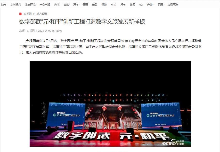 报道原文:央视网消息4月8日晚,数字邵武“元?和平”创新工程发布会暨首届Meta-City元宇宙嘉年华在邵武市人民广场举行。福建省工信厅副厅长郭学军,福建省工商联副主席、南平市人民政府副市长林湫,福建省文旅厅二级巡视员张立峰以及邵武市委副书记、市人民政府市长郭绯红等领导出席活动。
