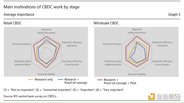 出于各种原因,各国央行仍在考虑发行CBDC。调查询问了一系列预先确定的动机,包括金融稳定、货币政策实施、普惠金融以及支付效率和安全。为了区分这些动机的相对重要性,各国央行对这些预先定义的潜在因素从“不太重要”到“非常重要”进行了排序,针对发行零售和批发CBDC。