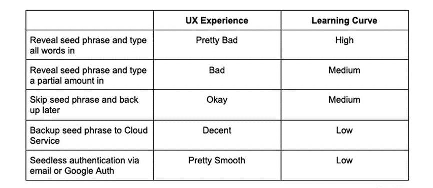 对于进入Web3领域的个人来说,这是最困难的部分。他们通常会始于一个欢迎屏幕,被程序问候,以保存和存储一个24字的种子短语。这与用电子邮件注册或用谷歌登录的用户行为非常不同。我见过一些护照有很好的上手引导,但也有一些护照犯了一个错误,就是假设用户知道什么是种子短语。使用账户抽象和MPC基础设施,这将有助于改善这一过程。更多内容请见下面的章节。