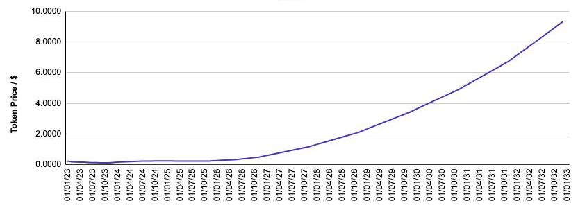 强用户增长创造了对代币的需求,因此代币价格在达到每个代币0.12美元的底部后开始升值。代币价格最初下降是由于最初投资者群体的锁定代币的出售压力,以及与第一年末仅有9,537名用户的相对较低用户数量,两者共同作用产生的结果。QTM模拟工具的一个重要优点是可以轻松更改输入参数。在这种情况下,检查另一种归属时间表方案的效果是有意义的。例如,将所有早期投资者的锁定时间加倍将导致最初的代币价格下跌至0.19美元。