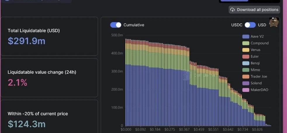 最糟糕的是Aave和?Compound?等借贷市场上的级联清算——在-20%的价格范围内有1.24亿美元的USDC清算。