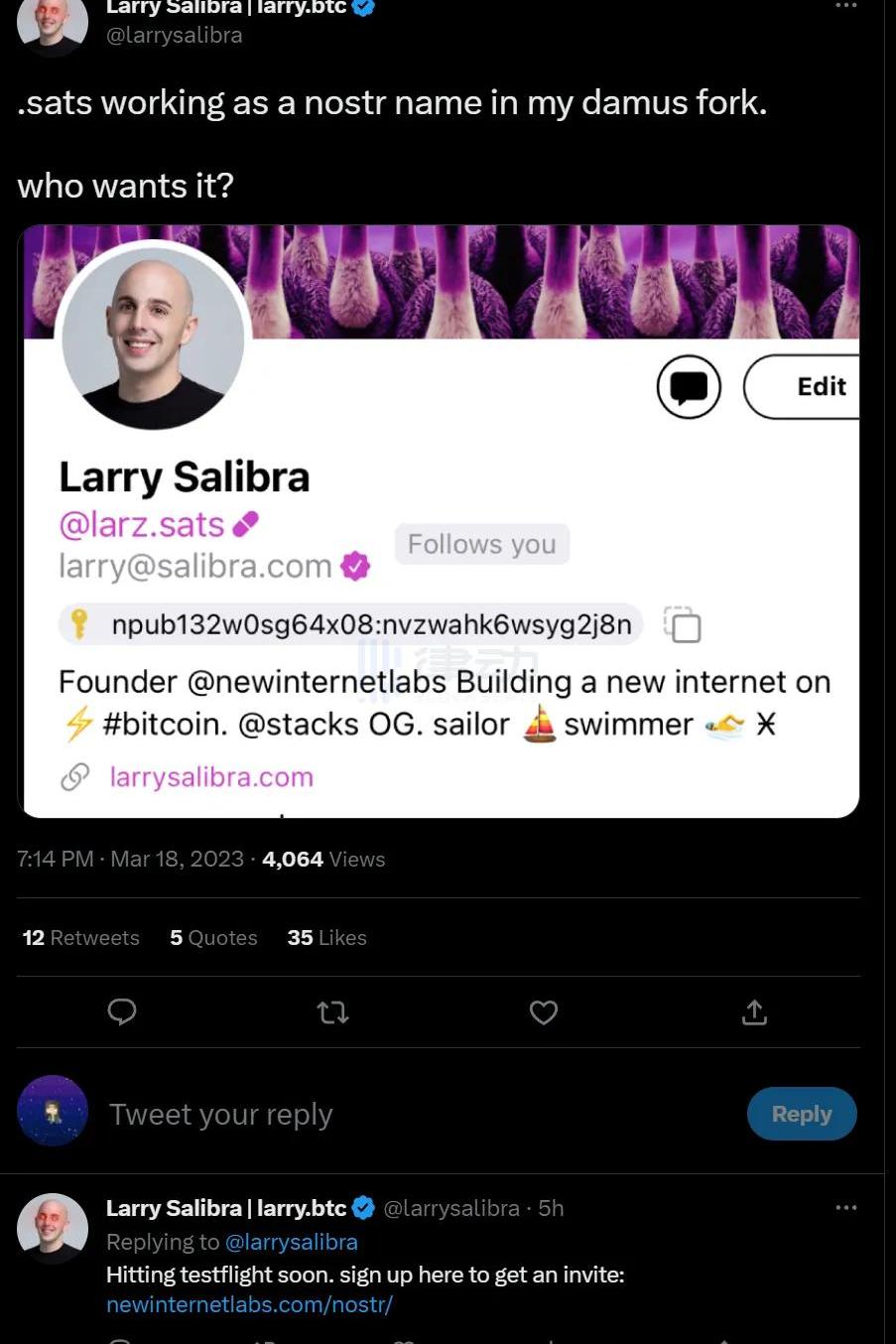 又比如,基于去中心化社交协议Nostr的首个社交应用「Damus」即将支持以.sats域名作为用户名。