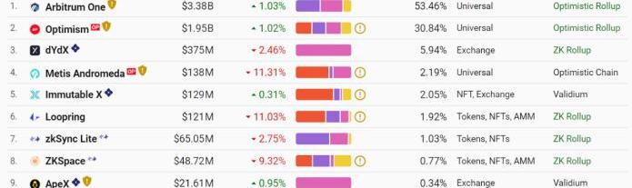 dYdX:加密货币和衍生品交易所,TVL达$375MLoopring:L2交易,NFTs,TVL达$121MzkSyncLite:L2交易,NFTs,TVL达$65MSpace:L2交易,NFTs,TVL达$49M