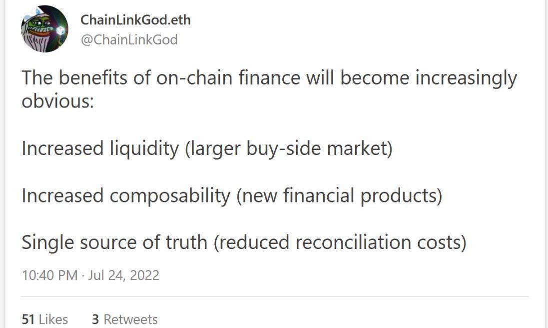 所以通过将DeFi更名为「链上金融」,行业可以在承认中心化的同时保持关键优势,如自我监管、增加流动性、可组合性和单一数据来源。