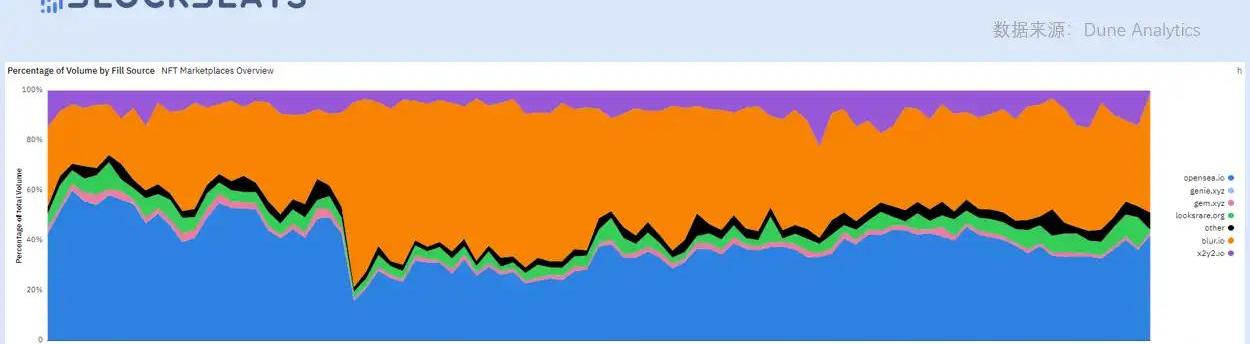 NFT交易所市占比从DuneAnalytics?数据可以看出,在Blur第三轮「BidtoAirdrop」空投活动上线前,Blur与OpenSea的较量可谓有来有回,但自第三轮空投活动推出后,逐渐让胜利的天平向它倾斜:Blur的交易额一度占据了整个NFT市场的74%,虽然后续有些许回落,但能与OpenSea平分秋色。