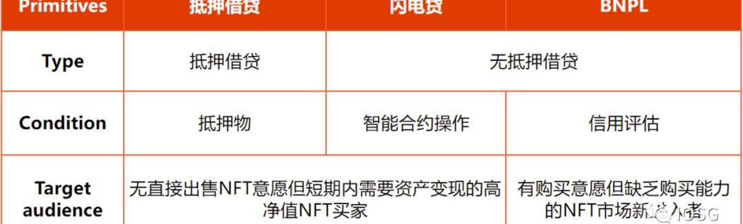 目前大部分的NFT借贷范式基本为Compound,Aave等协议中存在的三种:点对点撮合,流动池和稳定币,提供超额抵押借贷或闪电贷等功能。而BNPL这类新兴的无抵押私人借贷则可能在需求侧引入更多样的用户客群。我们从下图更直观地理解抵押借贷和无抵押借贷两个垂类: