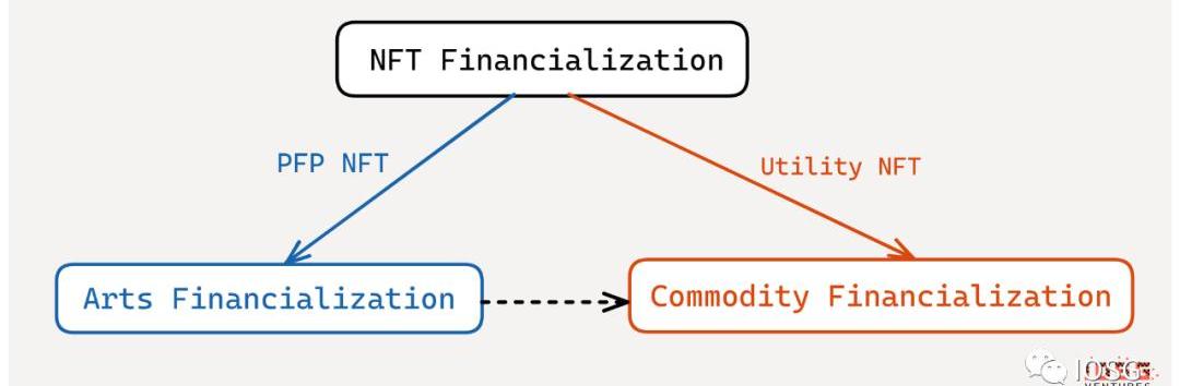 从纯粹经济学角度出发,我们试图提出的一个有趣但不一定正确的观点是,将NFT分割为A、B两类:A类为具备观赏和收藏价值的NFT;B类为具备使用价值的NFT。在此基础上,将A类NFT的金融化与艺术品金融化对标,B类NFT的金融化与大宗商品金融化进行对标: