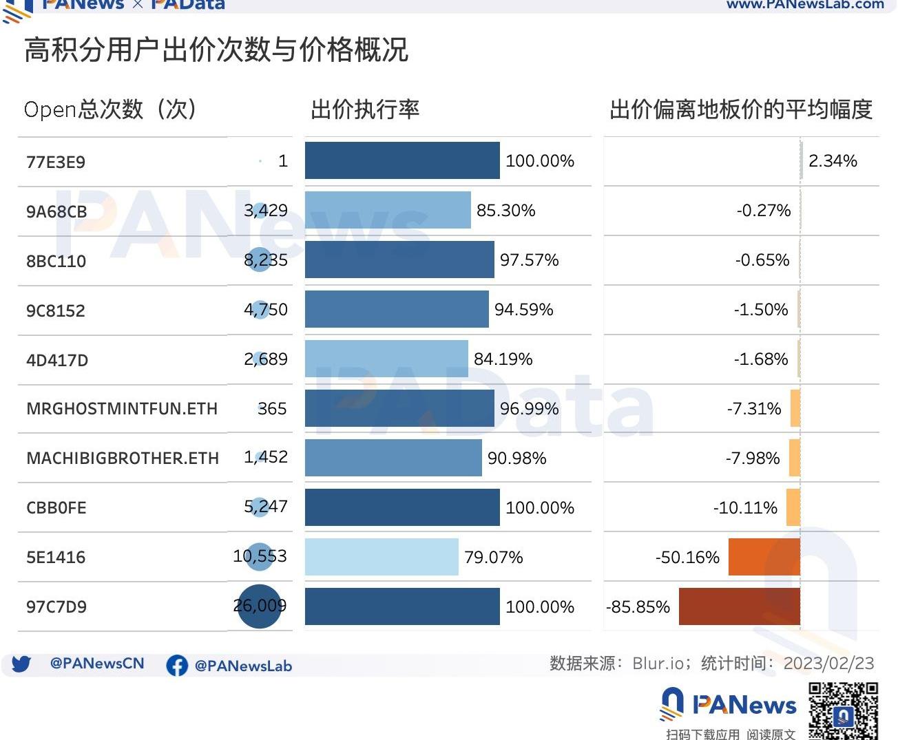 从更微观的Bidding行为来看,10个高积分用户有效出价总次数约6.27万次,平均出价偏离地板价的幅度约为-16.32%,平均出价执行率约为92.87%。但是,不同高积分用户有效出价次数和出价偏离地板价的幅度有很大差异。