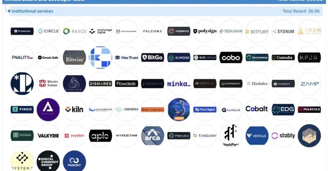 包括GnosisSafe、Cobo、BitGo在内的63个机构资金管理工具共计融资69亿美元,通过提供代币托管、质押、交易、经纪商、流动性聚合器、做事等工具和服务帮助更多企业和机构进入加密生态。