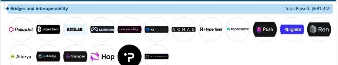 以Polkadot和LayerZero为代表的18个跨链工具共计融资6.8亿美元,在生态中的主要角色为促进不同的区块链网络之间信息的交换。常见的技术为三类-Lock&mint在原网络上锁定后在新链重新mint、Burn&redeem烧掉后拿新的以及nativeswap系统原生的交换。