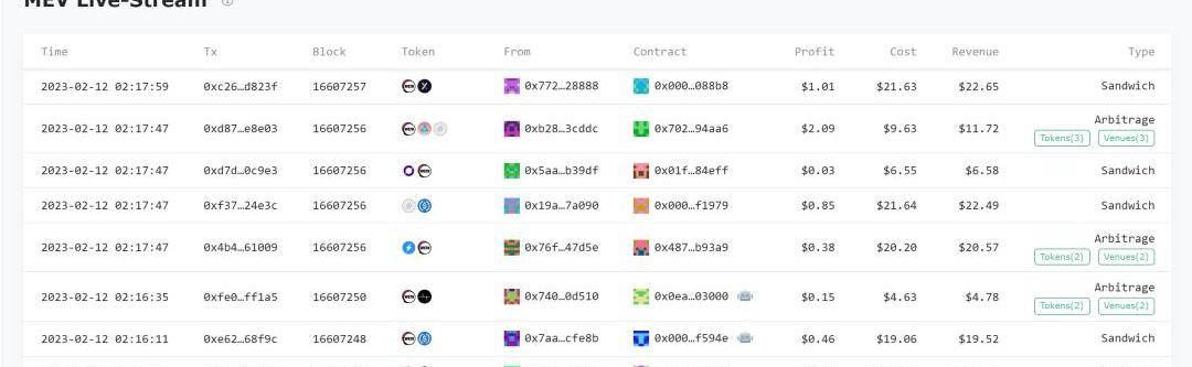 MEV实时流监控:实时的MEV交易展示流也能够方便搜索者迅速定位目前发生价格异动的代币和代币对流动性池。假如MEV实时流的交易代币都是WETH/USDC,那么很有可能是某一个WETH/USDC流动性池与其他的池存在价差,从而出现了大量的MEV套利机会。