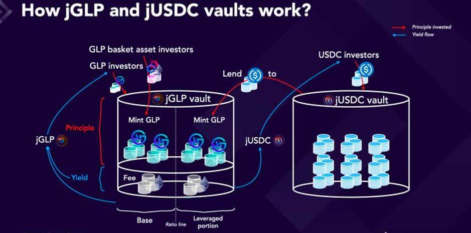 在这两个池中,USDC投资者把USDC放入jUSDC池,而jUSDC国库借出USDC给jGLP国库;同时GLP和GLP篮子资产的投资者也会把资产放入jGLP国库用来铸造GLP产生费用。该费用和GLP的流动性挖矿都可以提高jGLP的价值反哺给GLP投资者。费用还有助于增加jUSDC的价值来反哺USDC持有者。