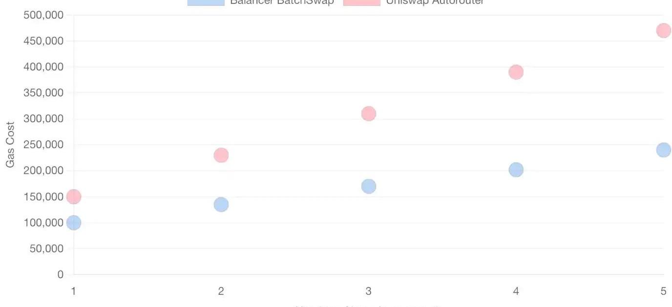 如下图所示,可以看出相比之下BalancerBatchSwap在Gas消耗成本上有多高效,通过创新的Vault设计,所有存入到Balancer中的LSD都可以无缝利用其流动性中心进行交易。