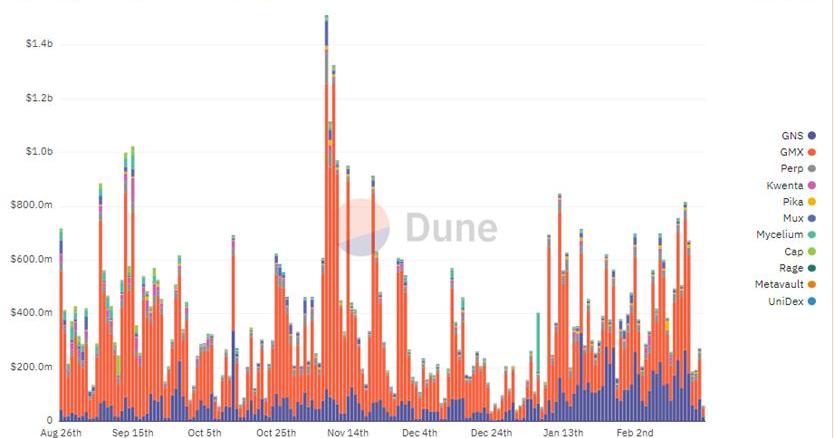 目前Gains是Arbitrum上交换量仅次于GMX的第二大衍生品DEX,市值2.7亿美元。