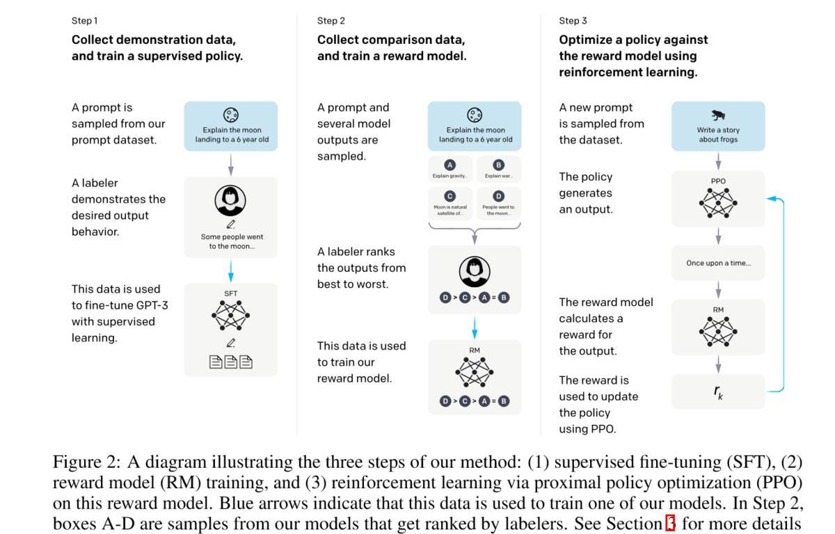 标注人员手写(prompt,completion),然后进行SFT。这里主要是得到一个比较好的初始化模型,即模型至少能有一定的followinstruction的能力。收集模型输出并进行打分,然后训练一个rewardmodel。利用强化学习优化模型。