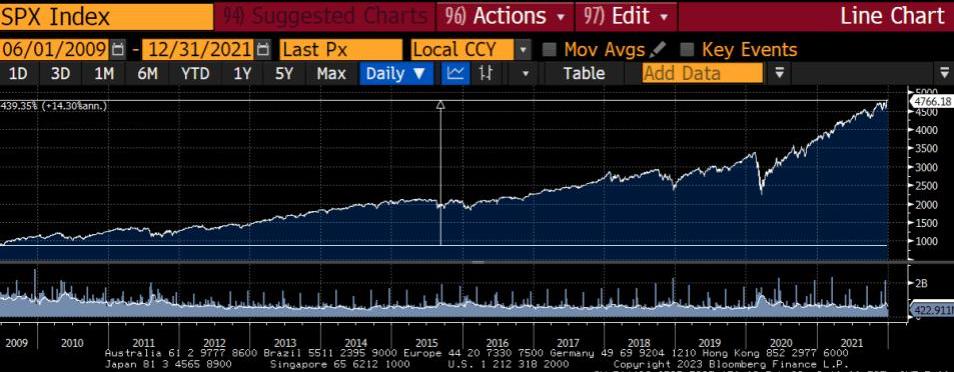 从2009年6月到2021年12月,标准普尔500指数持续反弹了440%。它继续反弹是因为美联储继续向市场提供免费资金。?