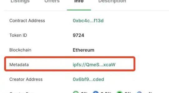 因为为保证数据不可篡改每个全节点都需要进行备份,有1万个矿工时,即使为了存储1MB的信息也会全网消耗掉10GB,这非常的不划算,于是提出的解决方案是将数据存储在链下,然后将链下存储地址放到区块链中进行索引,以NFT为例,可以看到metadata是索引到了一个ipfs的链接,打开后则是一个文件夹。