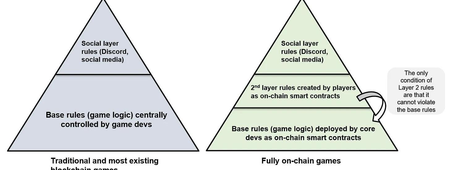 只要第二层规则不违反基础规则,它们就是被允许的。值得注意的是,第二层规则与现有游戏中的附加组件/mods不同,后者只改变你的个人用户界面和本地体验;它们被嵌入链上智能合约,影响与所有其他玩家共享的虚拟游戏体验。