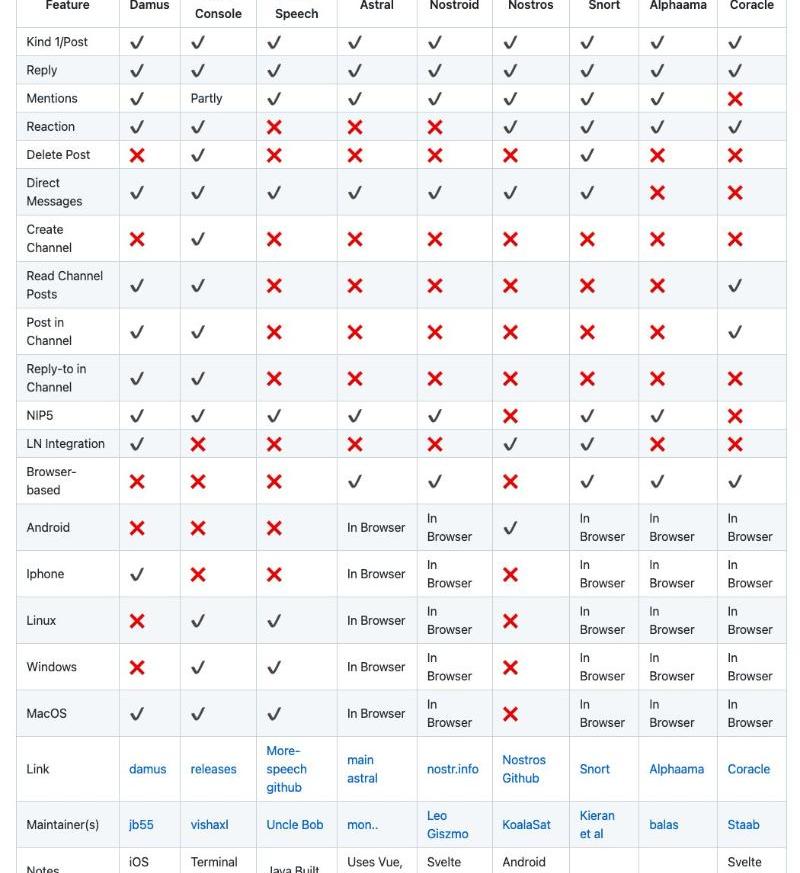 同时,大家不可避免会将其和推特这样经典的WEB2社交产品进行对比,只是有的人在对比过程中会错误匹配,比如将Twitter和Nostr进行对比,或者说将Damus等同于Nostr,这里的误区在于,Nostr本质是协议,Damus是根据协议开发的第三方应用,类似于Damus这样的应用还有很多个,以下为Nostr不同客户端实现的对比。